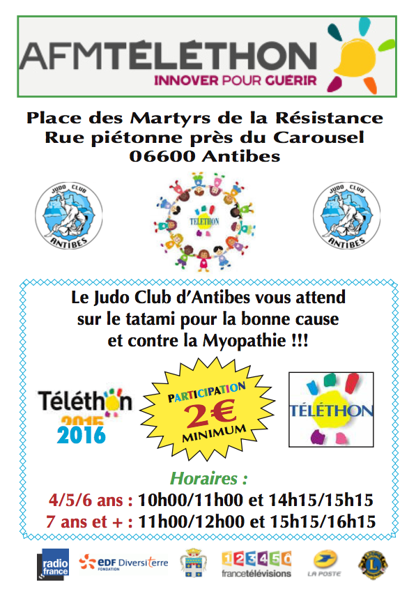 TELETHON, le judo club d’antibes serat présent. ced Posted on 18 novembre 2016 Publié dans Uncategorized No Comments Le samedi 3 décembre 2016 le J.C.A serat présent au téléthon. Retrouvez toutes les information sur l’affiche ci-dessous.